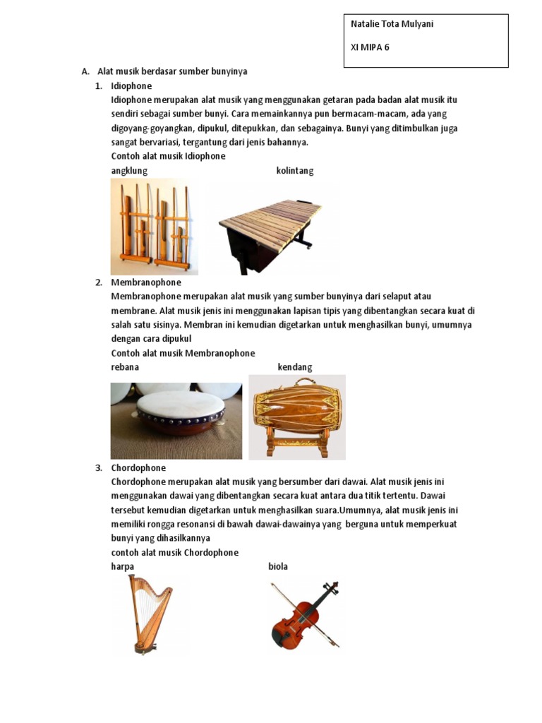 Idiophone merupakan jenis dari peralatan musik yang suaranya dihasilkan dari resonansi benda metal atau logam yang terdengar ketika alat musik ini digoyang, di gesek, di tepuk dan lain sebagainya. Yang termasuk contoh alat musik chordophone yaitu. Chordophone, yaitu jenis alat musik yang sumber bunyinya berasal dari dawai atau senar. Alat musik yang menggunakan senar/dawai sebagai sumber bunyinya disebut. Membranofonmembranofon adalah golongan alat musik yang sumber bunyinya berupa membran atau selaput kulit yang dipasang pada sebuah kotak atau. Ideofon yaitu alat instrumen musik yang sumber bunyinya berasal dari bagian instrument music itu sendiri. Alat musik yang menggunakan selaput tipis sebagai sumber bunyi dinamakan. Alat musik kecapi ini berasal dari provinsi jawa barat. Seiring dengan berjalannya waktu, alat musik petik yang satu ini terus. Yaitu alat musik dimana sumber bunyinya bersumber pada getaran pada selaput tipis yang terbuat dari kulit atau plastik yang berbunyi dengan cara dipukul. Soal yang akan kami bagikan ini sudah berbasis hots (higher order thinking skill). Dan alat musik ini sangat bernilai. Yaitu alat musik yang berfungsi menghasilkan irama atau ritme saat dimainkan seperti ketipung, konga, bongo, bass, drum set dan kendang.