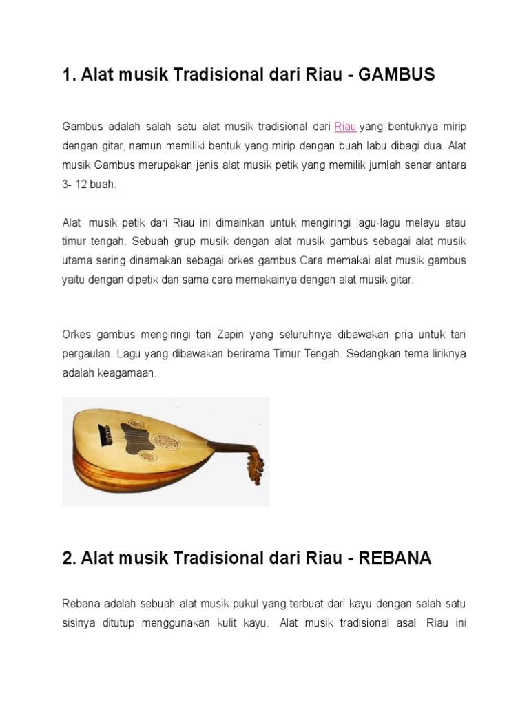 Gambus sendiri merupakan salah satu alat musik yang cara memainkannya adalah dengan cara dipetik. Dimana alat musik yang dimainkan dengan cara dipetik pada bagian senarnya dan menghasilkan jenis bunyi kardofon ini sangat kental dengan adat melayu. Alat musik tradisional ini berasal dari provinsi riau dengan bentuk menyerupai terompet. Cara memainkan gendang melayu tidaklah jauh berbeda dengan rebana atau gendang pada umumnya, yaitu dengan cara dipukul secara langsung. Foy pay juga selalu dimainkan bersama foy doa, nada yang dihasilkan dari foy pay adalah do, re mi, fa dan sol. Alat musik gambus ini dulunya berfungsi sebagai sarana hiburan yang lebih religious dan dimainkan individu dirumah. Alat musik foy pay adalah alat musik yang terbuat dari bambu, sekilas mirip dengan dengan foy doa namun ukurannya jauh lebih besar. Alat musik gambus merupakan jenis alat musik petik yang berasal dari wilayah timur tengah. Fungsi dari alat musik in sendiri yakni untuk mengiringi gedombak adalah alat musik tradisional dari riau yang memiliki bentuk sangat unik seperti tropy piala dunia. Serangko merupakan alat musik yang terbuat dari tanduk kerbau. Jika di provinsi riau gambus di mainkan dengan cara di petik dan mempunyai enam dawai erta terbuat dari sebuah kayu. 10 alat musik tradisional kepulauan riau tradisikita masyarakat di kepulauan riau kepri terdiri dari berbagai suku. Gambus memiliki 3 hingga 12 senar pada tubuhnya.