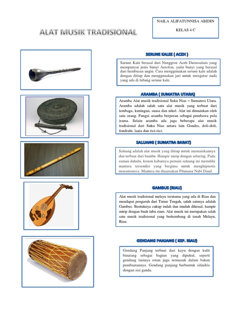 Pada masa persebaran islam yang dibawa bangsa timur tengah, gambus menyebar sampai ke seluruh masyarakat melayu. Alat musik ini berasal dari jambi, biasanya juga digunakan untuk pemberitahuan musibah. Jika di provinsi riau gambus di mainkan dengan cara di petik dan mempunyai enam dawai erta terbuat dari sebuah kayu. Nelayan dari timur tengah pun sering menggunakan alat musik ini sebagai hiburan ketika sedang dalam pelayaran menggunakan perahu. Dengan memetik pada bagian senar yang terdapat pada kerangka gambus menggunakan. Foy pay juga selalu dimainkan bersama foy doa, nada yang dihasilkan dari foy pay adalah do, re mi, fa dan sol. 60 alat musik tradisional indonesia daerah asal gambar. Fadhli syar jumat, mei 18, 2012. Alat musik ini sering dimainkan ketika ada. Sebenarnya tidak tahu persis berapa jumlah alat musik daerah riau ini, bisa jadi lebih dari 10 buah. Cara memainkan gendang melayu tidaklah jauh berbeda dengan rebana atau gendang pada umumnya, yaitu dengan cara dipukul secara langsung. Apabila ingin menggunakannya, cukup dengan menepukkan area gendang yang lunaknya dengan tangan kita. Pada masa kesultanan malaka ini banyak pedagang dari timur tengah masuk ke daerah melayu.