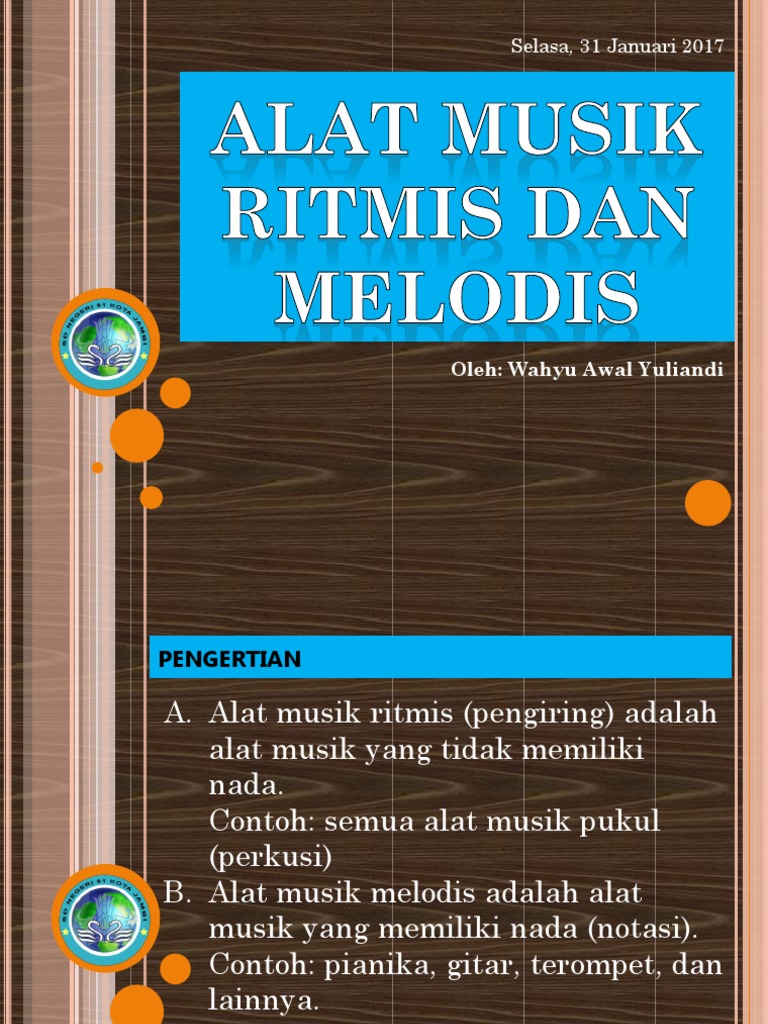 Adalah alat musik yang menghasilkan nada dan mempunyai irama alat musik ritmis adalah yang tidak memiliki. Dengan kata lain, alat musik ritmis adalah alat musik yang dijadikan sebagai pengiring lagu.